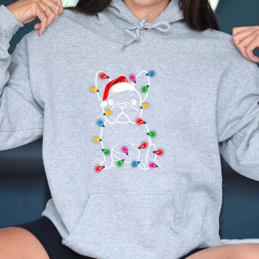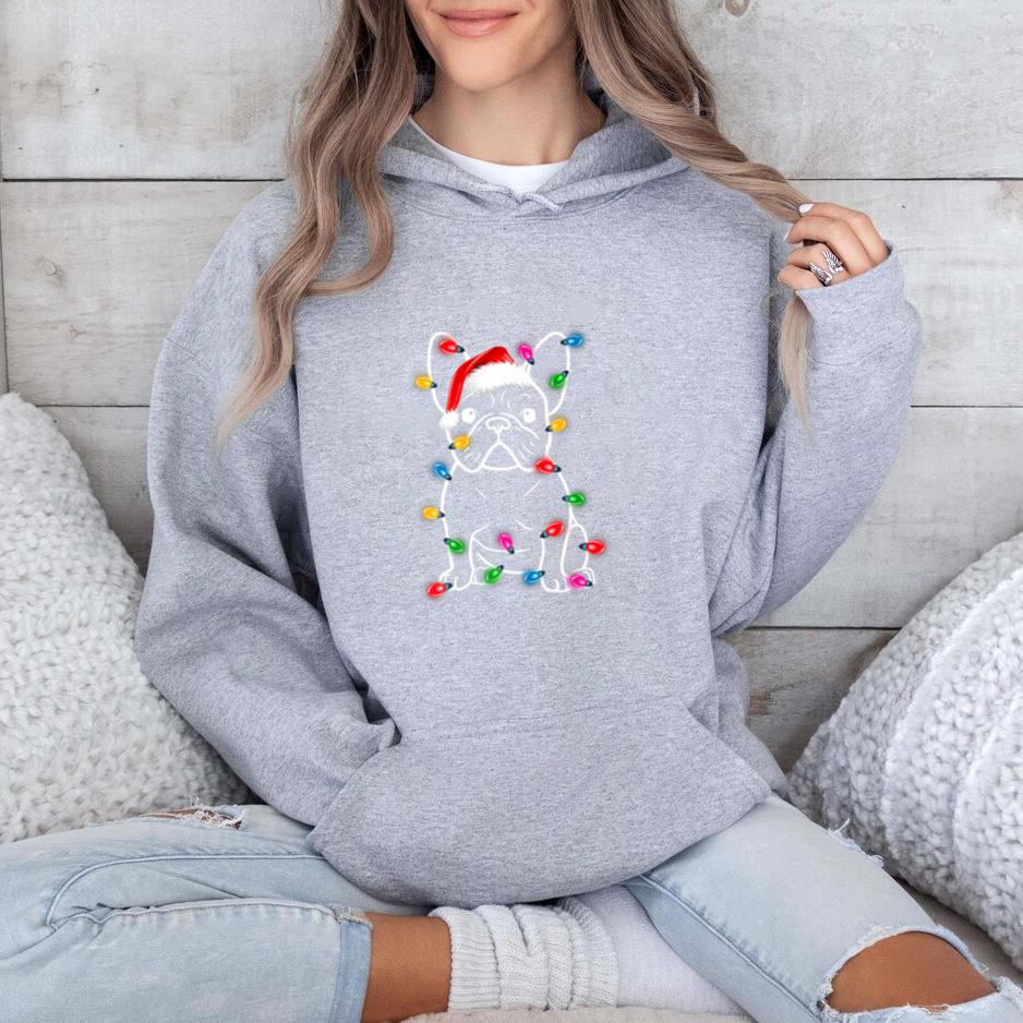 The Christmas Lights Dog French Bulldog Hoodie hoodie combines comfort warmth and style for a go anywhere piece that works in any season. Soft inside and durable outside it is perfect for layering or lounging